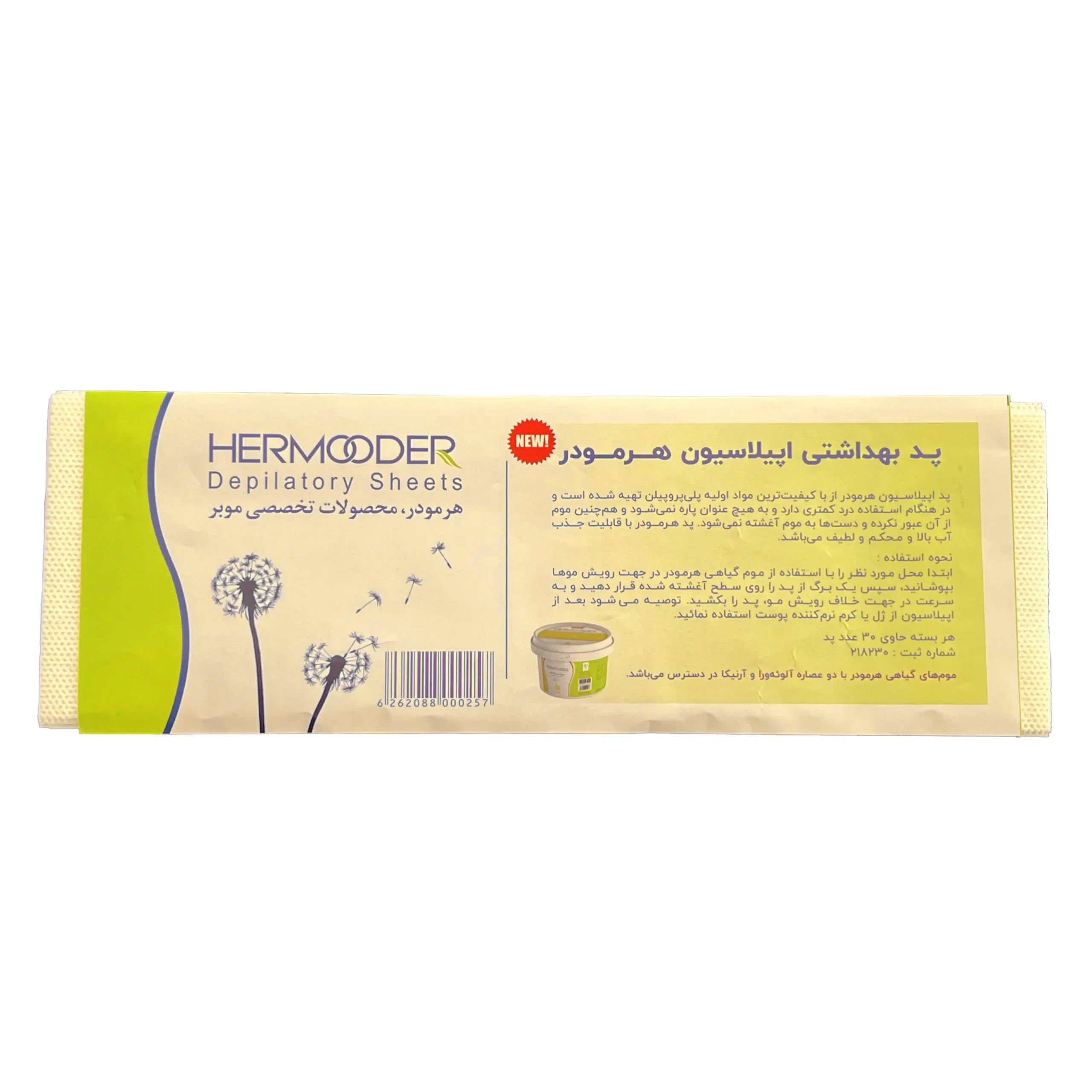 پد اپیلاسیون هرمودر از اسپانباند بهداشتی و با گراماژ بالا تهیه شده است که در برابر حرارت موم تغییر شکل نمیدهد. این محصول شامل 30 عدد پد مقاوم و باکیفیت بوده و تجربهای آسان و مؤثر برای اپیلاسیون فراهم میکند.